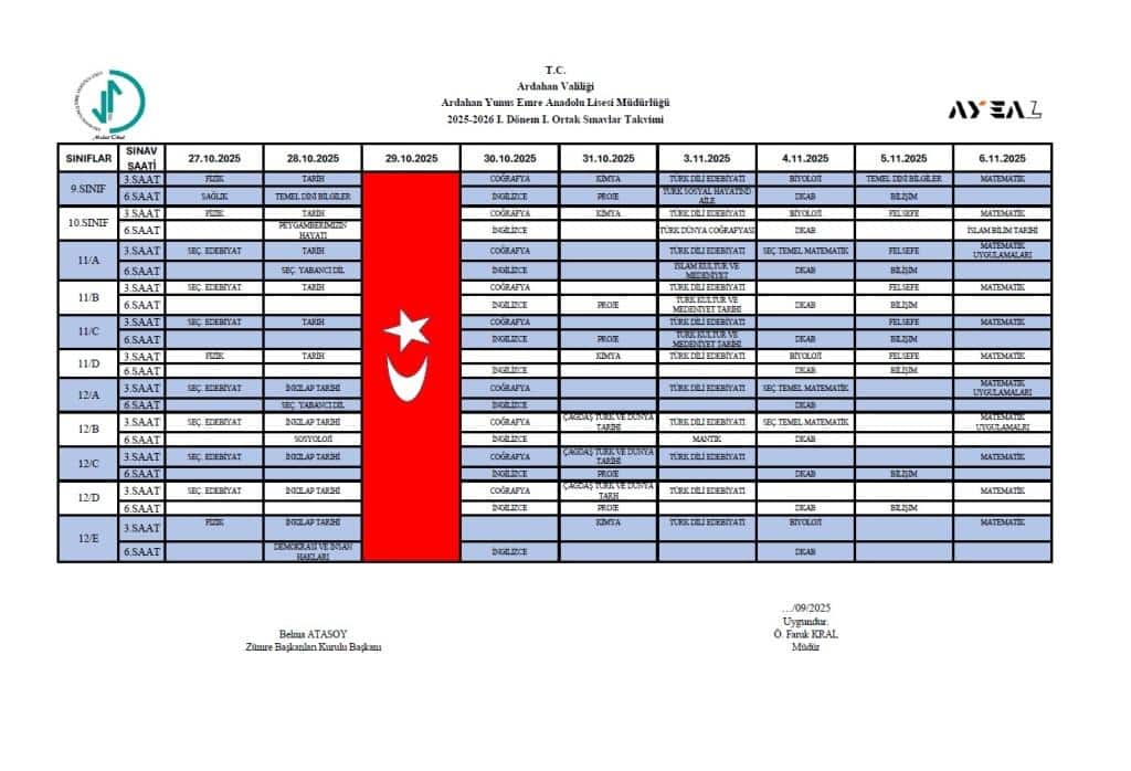 I. Dönem I. Ortak Sınav Takvimi